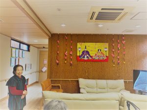 ひな祭りの壁面飾りがようやく完成しました😍お内裏様の衣装などすべて貼り絵で完成しました お雛様の花模様は着物の柄の千代紙を使っています🎎「えーのん出来たなぁ」と笑顔満面の入居者の皆様💖その言葉にスタッフもにんまり一緒に完成を喜びました🥰