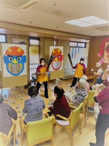 チーム対抗で節分の行事を楽しみました😁鬼がこん棒で阻止する横をボールが通り過ぎます🎭「入ったぁ」という間もなく飛んでくる玉🏏 2対1で青鬼さんチームが勝ちました🥇💖節分なので栄養課が鬼のお饅頭と豆をおやつに出してくれました🥮🍵