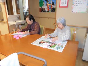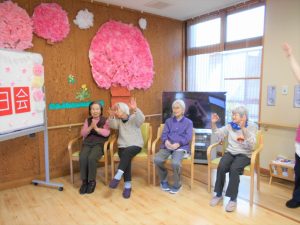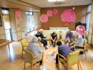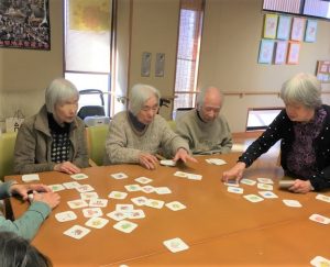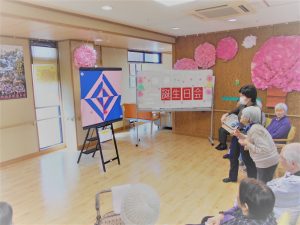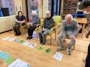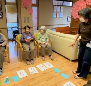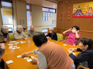 ひな祭りゲーム「早いもん勝ちゲーム」開催 立ち上がって遠くの札をとる入居者に負ける方もおられましたが考えて手を伸ばす動作も大事なので勝敗は関係なく楽しみました💖