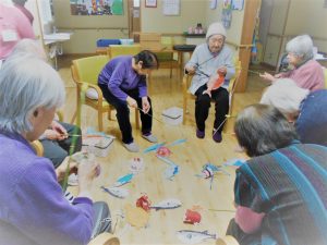 壁面に桜の道が出来ました。気分だけでも『桜咲く』です。皆様は魚釣りゲームに参加中。色を塗ったり巻いたり昨年一緒に作ったお魚が豊漁です。
