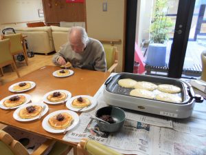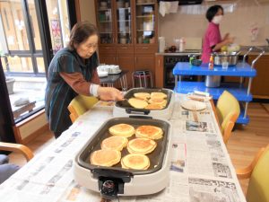 午後は おやつにホットケーキを焼きました🥞立ち上がって待ってくださる一コマもあり、皆様もくもくと完食☕「美味しかったぁ「ごちそうさん」と笑顔が見られました💛