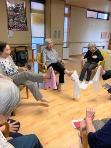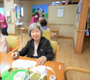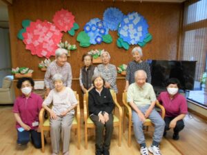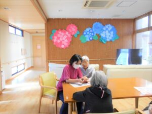 日曜日ですが、壁面飾り作成中です🏵アジサイの下にフエルトで水芭蕉を咲かせます。手先の器用な入居者が丁寧に切ったり巻いたり奮闘中✂。入居者がやりやすい手順になる様に、いつも家で下ごしらえして持ってきてくれるスタッフに心から感謝です💝壁面飾りの後は 爪切りの時間です😊