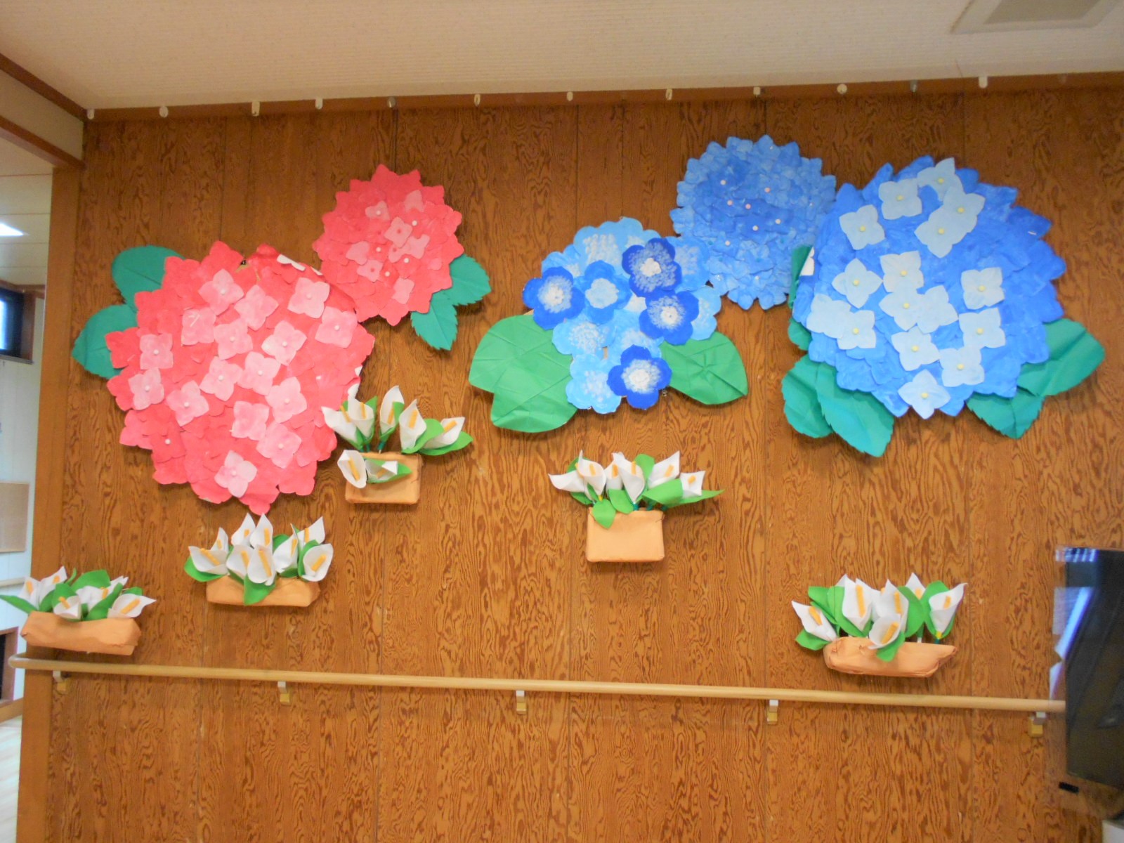 壁飾りが完成しました✨。完成記念に「アジサイと水芭蕉」の前で集合写真を撮りました📸