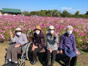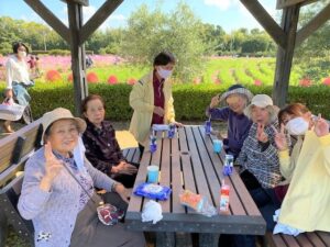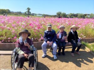安全の為2日に分けて、和泉リサイクル環境公園へコスモス畑を見に行きました🚐椅子などはすべて消毒をしています🧴「えーとこ連れてきてもろて」「満開やなぁ」「弁当食べられたらええのに」と口々に感想を述べられていました🧡お天気に恵まれて良かったです💐