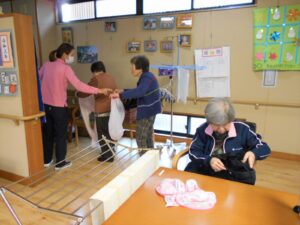 入浴で着替えた洗濯物を干しています。干し方は十人十色、記憶の中の自分なりの干し方です。普段の生活の一コマです。