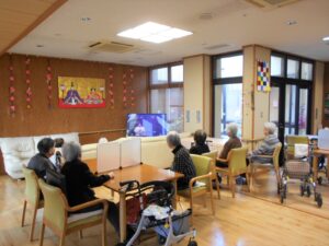 夕方、ユーチューブを使い懐かしのメロディを流しています🎵一緒に、口ずさむ方も多く時には合唱になります😊居室から出てきたり、椅子を移動したり、少しずつテレビ前に集合です😊