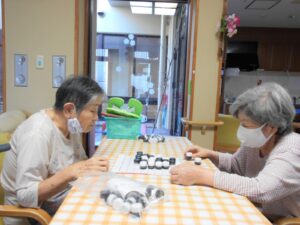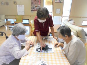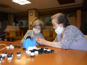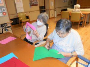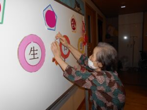 的当てゲームの的を作成中。レクリエーションの材料もお手製です。