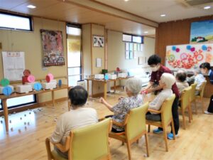 誕生日会を開催しました。レクリエーションは的当てゲーム! バランスよく配置したつもりでしたが 勢いよく、的を残さず打ち落とす青チームの圧勝でした❣