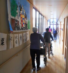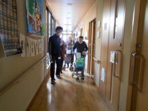 訓練を終え 理学療法士に付き添われ戻っています。緊張し涙される方もおられリアルな避難訓練になりました。