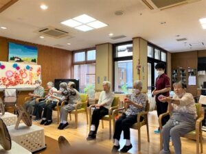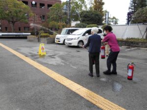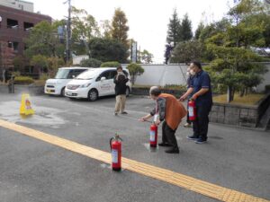 非常階段から降りた入居者は 消防訓練 消火にも参加しています💝
