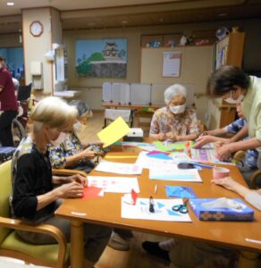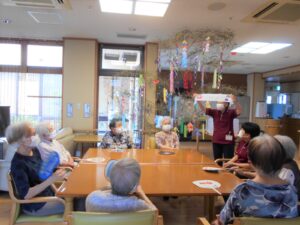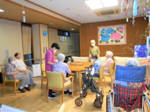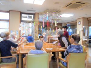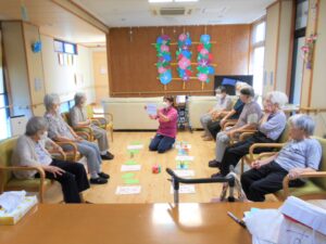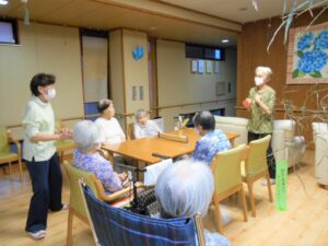 七夕当日です。短冊の願い事のお披露目をして 七夕ゲームをしました。天の川を薄い紙で作り団扇で落ちないように噴き上げるゲーム。パワー全開の皆様です。