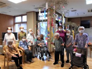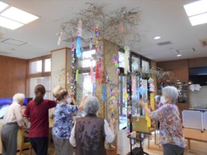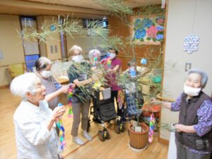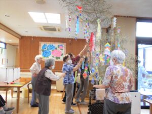 七夕飾りの短冊を書いていただき 最後の飾りつけをしました。