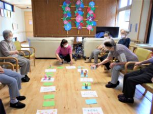 今日のレクリエーションは『すごろく』です。「花の名前を教えてください」「歌を唄いましょう」「手の運動を10回する」等、体や頭を使うメニューになっています。