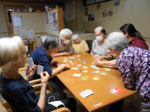 花火会の予定でしたが夕立ちがあり中止になりました。かるた取りで遊んだ後は昔話で盛り上がりました。
