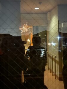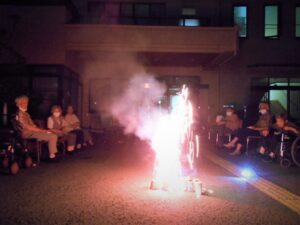 久米田池のあたりから 花火が上がりました。入居者の居室にお邪魔して花火鑑賞会です。「きれいやなぁ」と声が上がり 数分間の夏の思い出が出来ました。