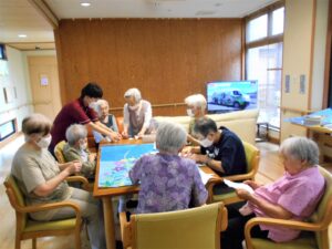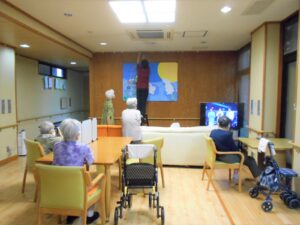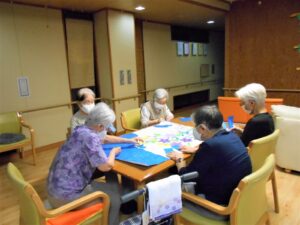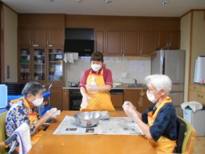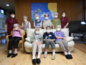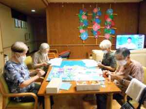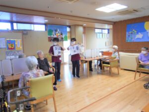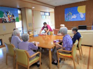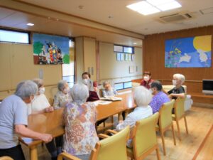 台風が接近中の『敬老の日』です。「台風大丈夫かなぁ」と気にしながらも、お饅頭を食べて、ゆっくり昔話を語らいました。懐かしい品物の絵を見せると「それ魔法瓶や」等、話がどんどん出てくるようです。昭和の時代を懐かしみながら敬老の日を過ごしました。