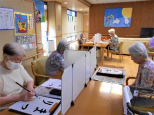 10月の習字を書きました。品評会が終わると拍手。今回も上出来です。