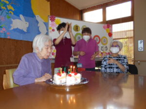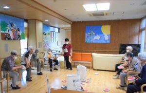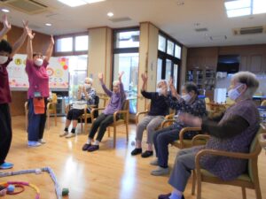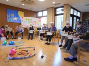誕生日会開催。青チームと赤チームに分かれ お手玉を投げ早くボールを枠の中から出した方が勝ちと言うゲームを行いました。スタッフも青赤チームに分かれ声援し大いに盛り上がりました。