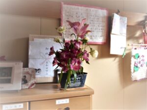 入居者様の活けた生け花です。今年90才。タペストリーも編まれお元気です。岸和田市長からの「卒寿」のお祝いも大事に飾っておられます。