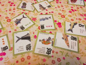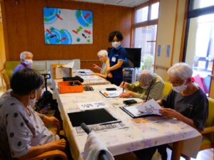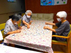 夕食後のひと時 「トト合わせ」のカードで頭の体操をしています。上手に組み合わせています。犬棒かるたが始まると他の方も集まってこられます。