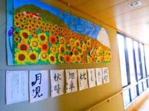 お習字を廊下に張り出しました。真夏の壁面飾りの下ですが、ご家族の皆様、来られた時にご覧ください。