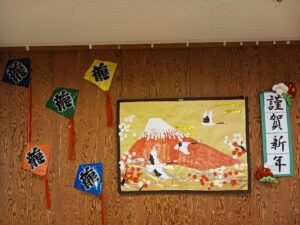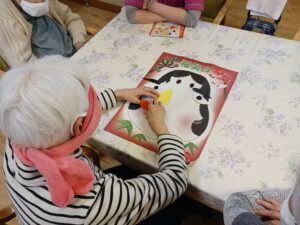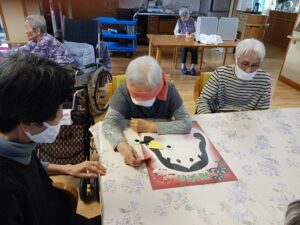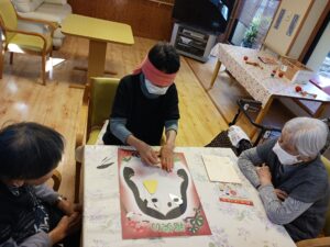福笑いはあっちやこっちやと言いながらしました。完成した福笑いを見ると皆さん良い笑顔でした。