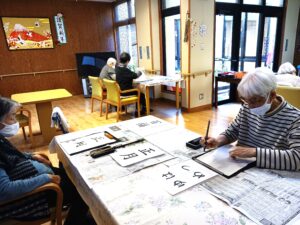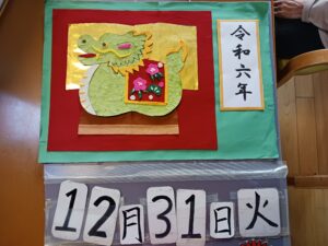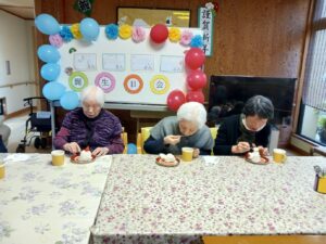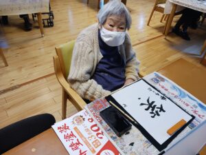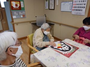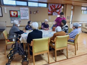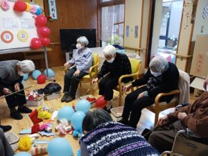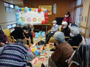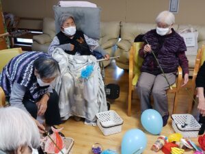 今日は1月生まれの方の誕生日会を行いました。今月は4名の方がおられ、全員が出来るゲームをと思い、魚釣りゲーム(誕生日Ver.)にしました。皆さん一斉に釣り始め、釣れるまで同じものを狙う方や釣りやすそうなものを狙う方と、皆さんの性格が現れていました。