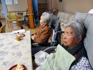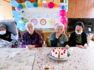 その後はケーキを囲み、誕生日会を行いました。誰がロウソクを消すのかとなりましたが、最年長の方が代表して消してくださいました。