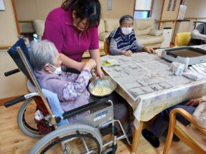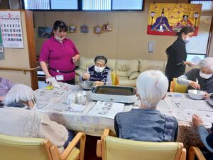 今日はひな祭りということで、桜🌸どらやきを作りました。まずは生地作り。食紅を入れてピンクにしてみました。中々の重労働で皆さんに順番に混ぜてもらいました。