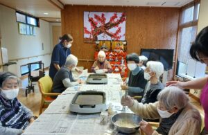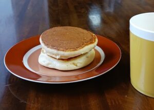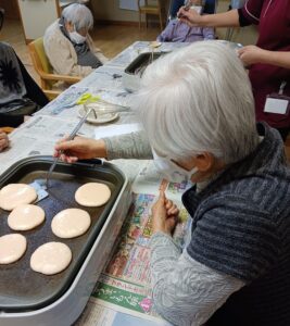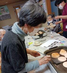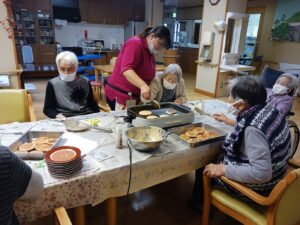 次はホットプレートで焼きに入ります。途中でブレーカーが落ちるなどのアクシデントがありましたが、美味しそうなホットケーキ(?)が出来ました。