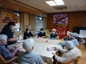 春の壁面飾りの作成中。みんなでひたすら花を折っています。