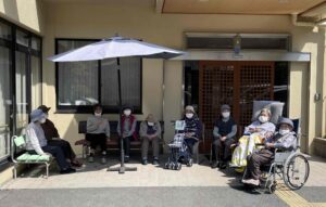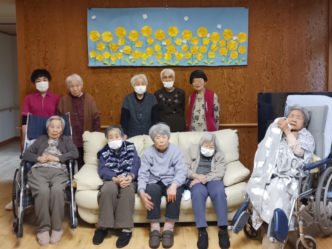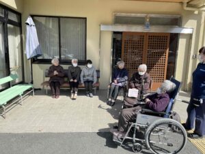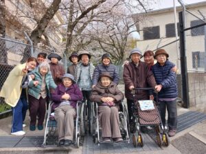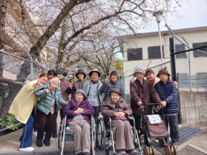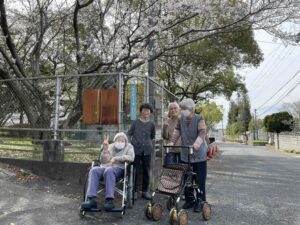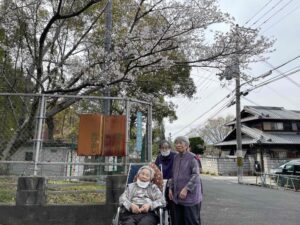 今日は車で流木公園にドライブに花見ドライブに行きました。駐車できなかったの写真は撮れませんでしたが、久米田病院のグラウンドで集合写真を撮りました。皆さん笑顔でいい写真が撮れました。きれいな桜が見れて皆さん喜んでくれていました。