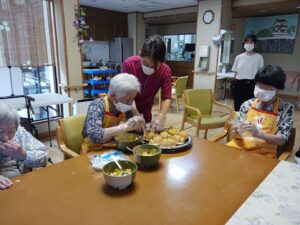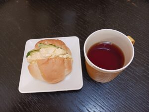 その後はおやつ作り。ロールパンがいっぱいあったので卵サンドを作りました。皆さんペロリと食べられていました。