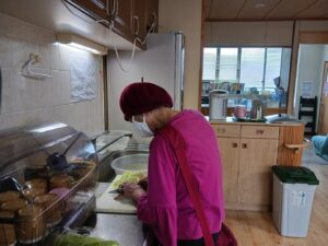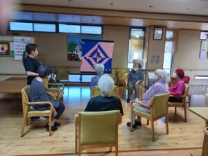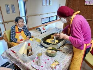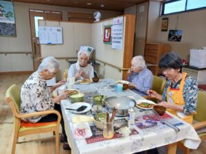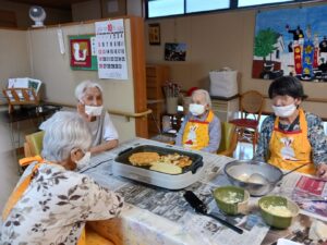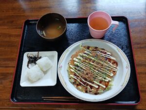 今日は祭りということで、昼食はお好み焼きを作りました。大きくて中々ひっくり返せないなどありましたが、皆さん美味しいと食べて下さいました。