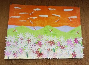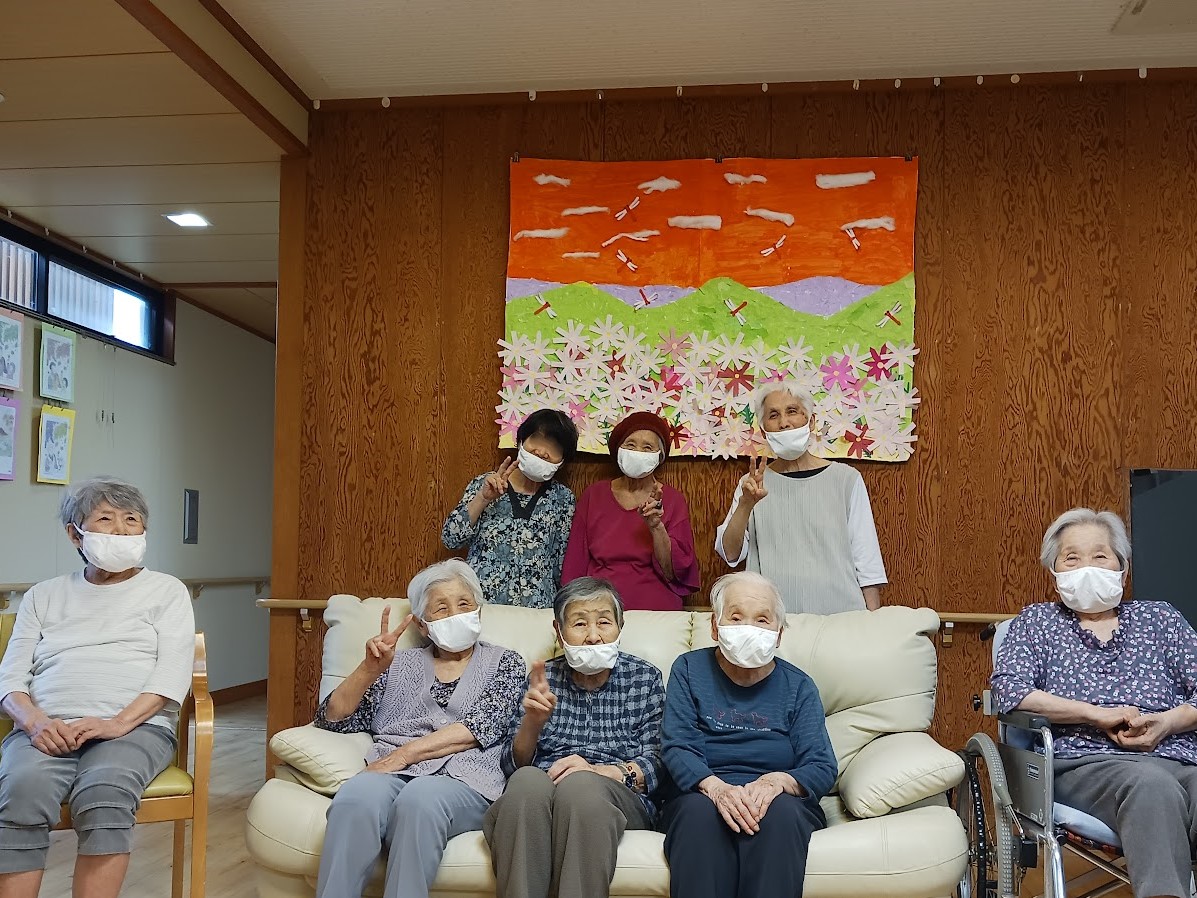 10月の壁面飾りと一緒に記念撮影。壁面飾りはコスモスと夕焼けです。
