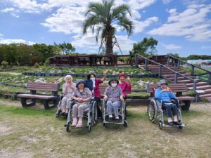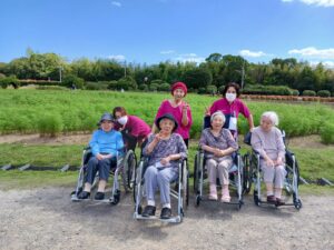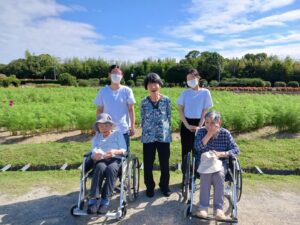 2日に分けて環境リサイクル公園にコスモスを見に行きました。まだあまり咲いていませんでしたが、天気も良く、風が気持ちがいいと喜んでもらえました。10日は看護学生さんと一緒に出掛けました。