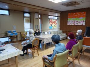 今日はピン球投げをしました。マジックテープを付けたピンポン玉を的に向けて投げるゲームです。皆さん投げるゲームはお好きなようで、前のめりで投げて下さいました。