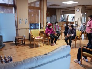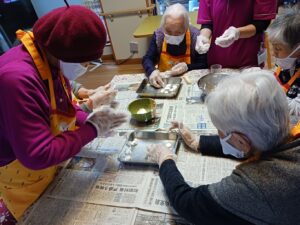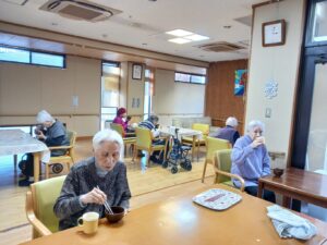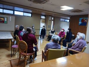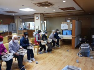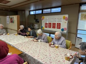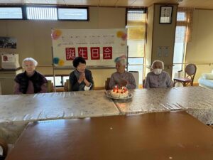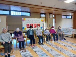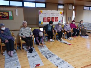 午後からは1月生まれ(4名)の方の誕生日会を行いました。足で新聞紙を手繰り寄せるゲームです。皆さん速すぎて写真が間に合わなかったです。もう一回とリクエストが入るなど、楽しんでもらえたようです。新聞紙を戻すスタッフがへとへとでした。
