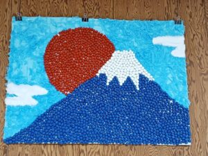 壁面飾り完成しました。富士山と太陽です✨お花紙を丸めて貼り付けています。