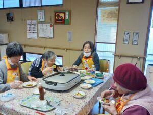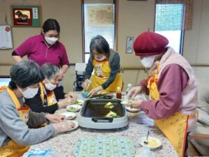 今日はおやつにピザを作りました。餃子の皮に具材を乗せてホットプレートで焼いています。温かい方が美味しいので、出来たものから食べてもらいました。中々好評だったので、また作りたいと思います。
