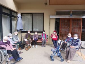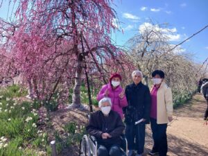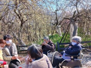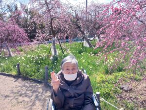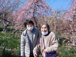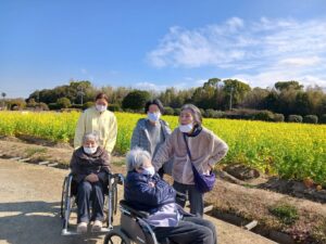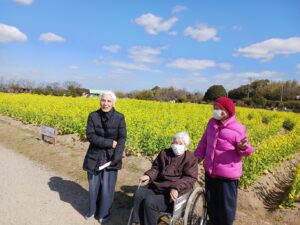 環境リサイクル公園の梅が見ごろとの事なので、2日に分かれてお花見に行きました。少し風はありましたが、天気も良く、菜の花・水仙・梅が咲いていました。皆さん「綺麗やなー」と喜んで下さっていました。