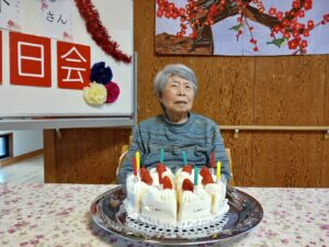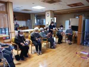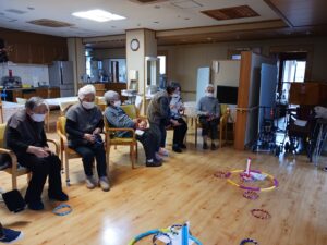今日は2月生まれの方の誕生日会を開きました。ゲームは赤チームと青チームに分かれての輪投げ大会をしました。フラフープの中に入れば点数になります。勝敗は赤チームの勝利でした。