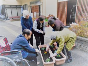今日は入居者の皆様と葉ボタンやビオラを植えました🌼「こっちのほうがええんちゃう」「こっちやで」いつになく笑いがない。真剣です💦皆さまゆっくりと考えながら植えて下さいました🌱春まで散歩の行き帰りに愛でることが出来ます💖季節感を感じる迎春準備です🎍